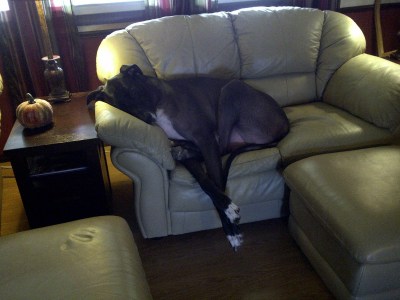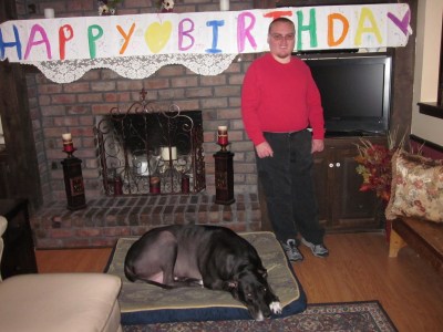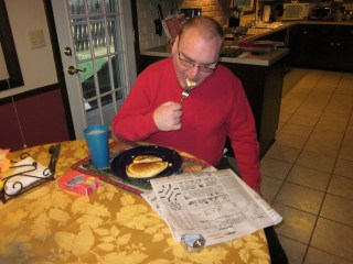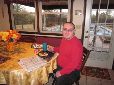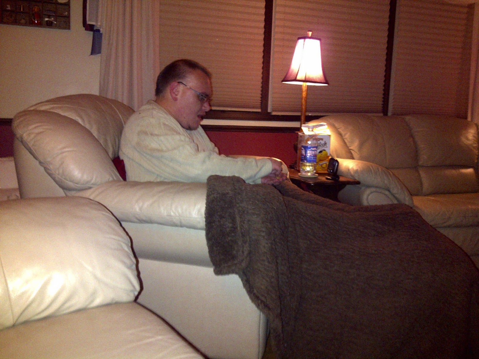 Here’s a typical picture of Aaron as he settles in for the game. If I get a little chilly and throw my fuzzy blanket over my legs, I have to say that our family room resembles a nursing home. No comments from my well meaning (yeah, right!) family and friends.