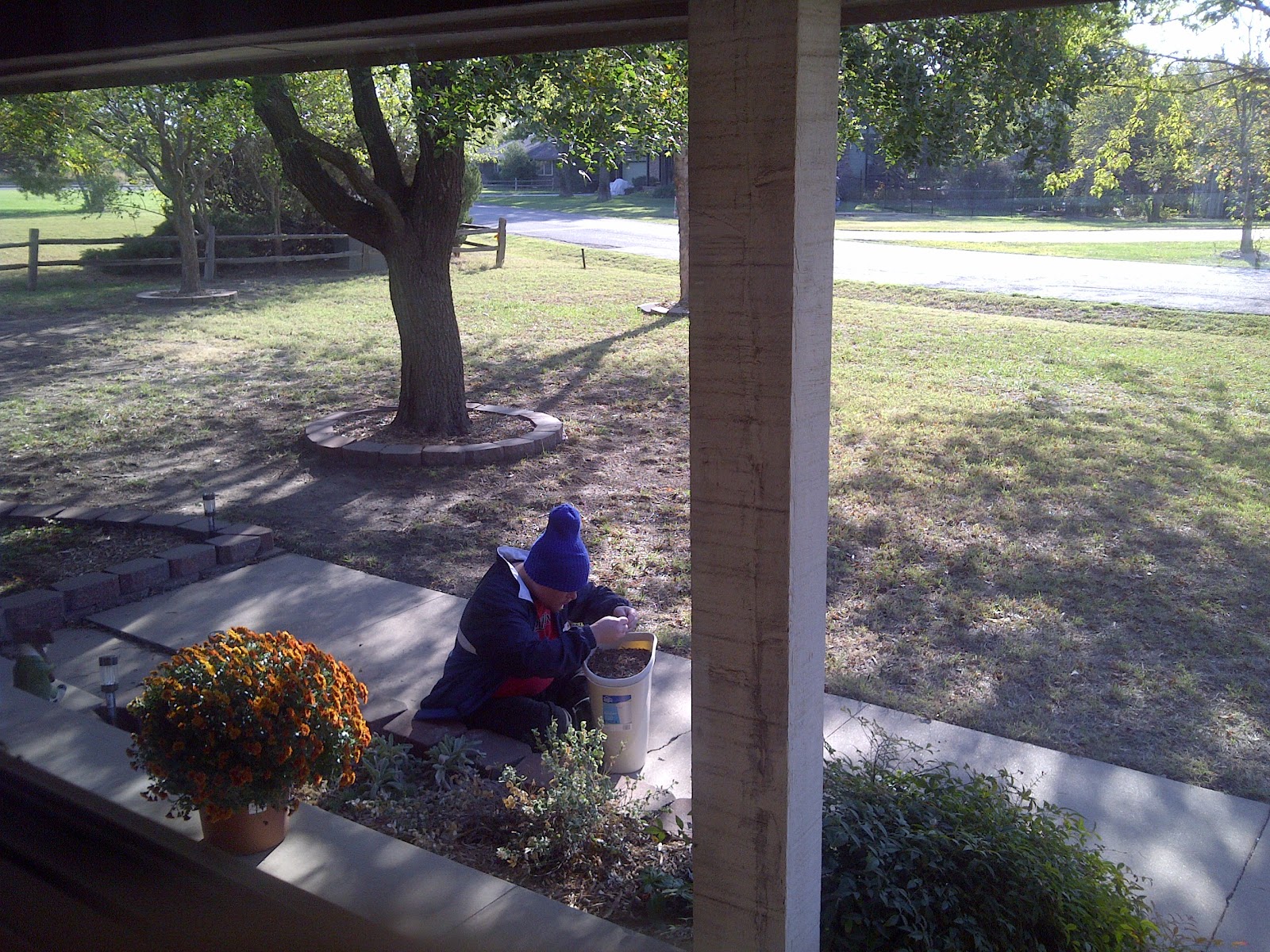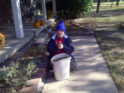 I’ve written before about how Aaron likes to go sit in the mulch, or beside the mulch, in our flower beds. He breaks the mulch into little pieces and watches as it drops into his special mulch trash can. He will fill the can to the brim, which takes weeks, and then we’ll pour it out somewhere – and he’ll begin anew to fill the can with his broken mulch. He has performed this ritual for many years, using leaves, sticks, grass, or mulch.
