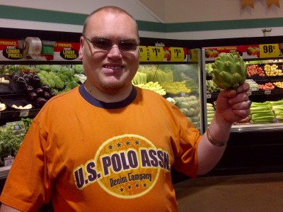 I was checking out the cantalopes and Aaron spied the artichokes. He quickly grabbed one and loudly said, “Mom! Remember these?” He was so happy with his find that I just had to snap a picture and laugh with him at this most unusual vegetable that he has always loved. Always, always, Aaron loves the unusual. He IS unusual, so it fits!