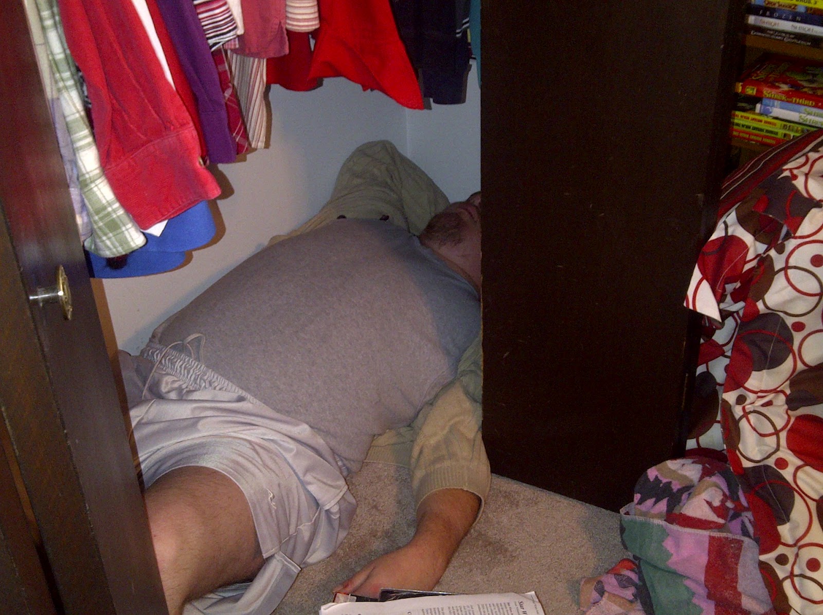 It began when I went into his room to get him out of bed………..and his bed was empty. He hasn’t played this trick in awhile, but I know what an empty bed and closed door usually means. It means that Aaron is hiding from me, just like a kid would do. It didn’t take me long to figure out that he was hiding in his closet because the door was slightly ajar………..and Aaron never allows the door to be partly open, even a crack. So I opened the door and there he was, laying on the floor like someone in a crime scene. He was very droll about this unusual sight of a grown man crammed into a little closet, laying on the floor, but he was also very pleased with himself for his brilliant hiding place.