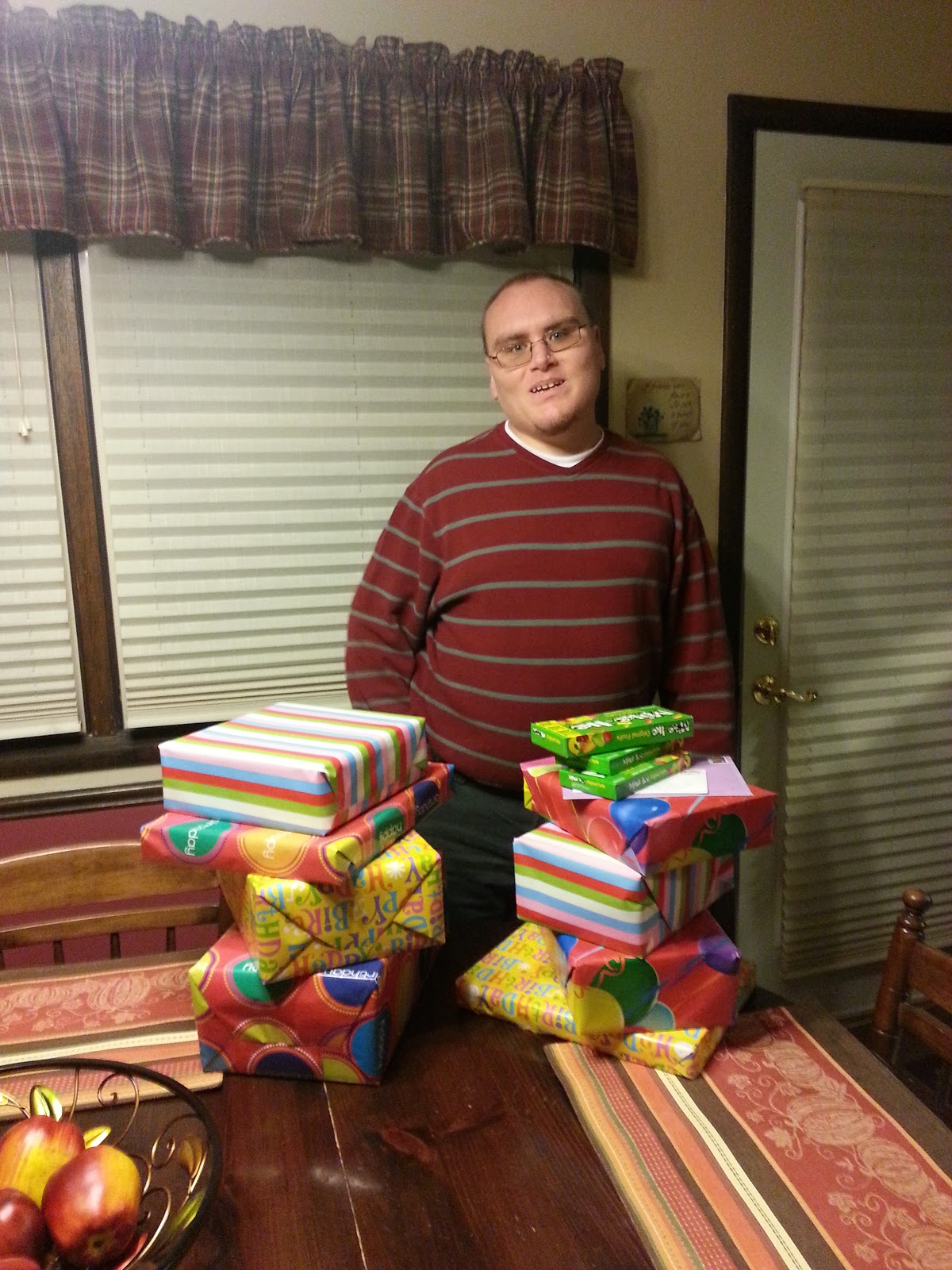 Finally, he was clean and ready to begin his wonderful day. He let me take his picture under our old family Happy Birthday banner that we hang up on each birthday, even though having his picture taken is not his favorite thing to do. He then followed me around the house, talking as usual about whatever popped into his ever active mind. Such as: “Mom, something last night was so much funny! I was reading my Handy Answer Science book. Have you ever seen a picture of Isaac Newton?”28 Years Ago