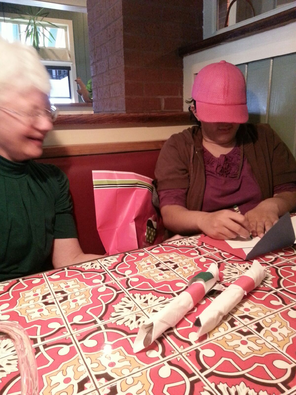 Finally we ordered our meals while we kept telling Aaron to speak quietly………and no, Aaron, don’t talk about that and no, don’t talk about this. His soft voice and filters were nonexistent at the moment! Rosie got to open her gift and her card, and was very happy with the crayons and the coloring book and card. She immediately opened the crayons and checked them out, holding some and examining others. Aaron continued to talk loudly, while Rosie calmly reminded her mom of things to tell us about………..a wedding, a shower, a baby, a shot in her arm. Aaron was pulling items out of his pockets that he had secretly brought to show to Rosie’s mom. Somehow we parents managed to visit a little, too, as we monitored our adult “kids” in their eating and their talking……..especially Aaron with the talking, and the show and tell!
