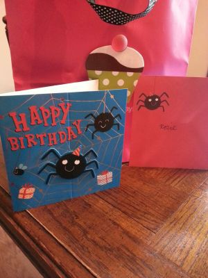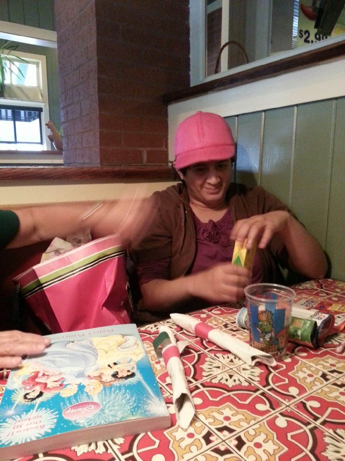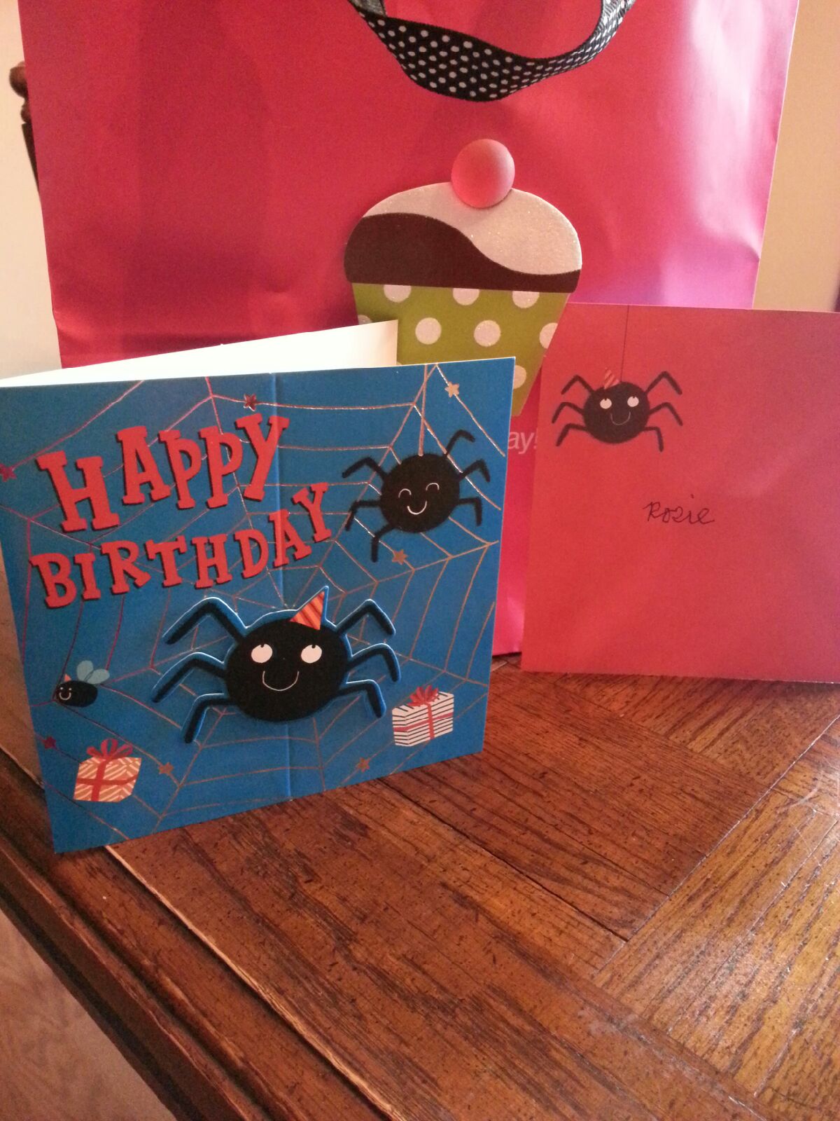 As is typical for Aaron, over the next few days he talked a lot about the upcoming birthday dinner with Rosie and her parents. Over and over again, we confirmed the day and the time and the location. Finally Tuesday, THE day, arrived. Aaron bounded in the door when he returned home from his day group, and he immediately asked me if we were still going to Rosie’s birthday dinner. He and I got Rosie’s special gifts all situated in a pretty gift bag. Aaron had previously picked out Rosie’s card. Of all the girly, pretty choices he had – Aaron chose a card with spiders on the front. He wouldn’t change his mind, so spiders it was for Rosie! He seriously signed her card, including his last name as he always does.