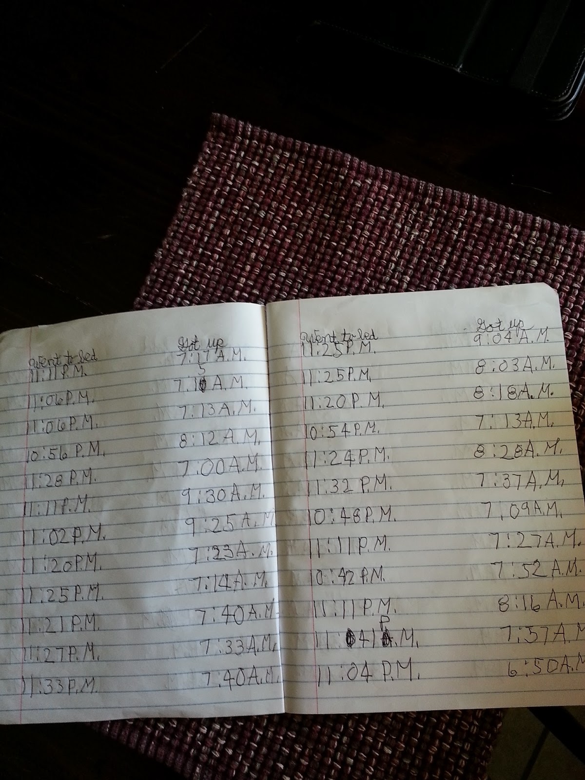 BED TIMES: When I say bed times, I mean that Aaron keeps a list of the times that he turns his light out at night, and the times that he gets up in the morning. He does this Every. Single. Day. Here is but one page of his recorded bed times. He has filled up multiple notebooks over the years.