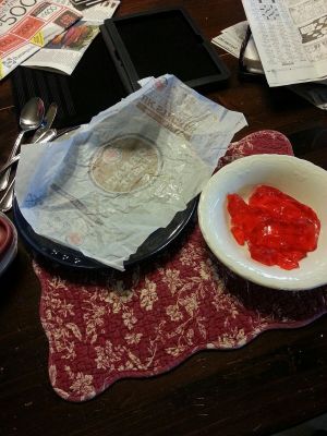 I fully shared Aaron’s relief, trust me! I praised him for doing so well as we drove through the Burger Kind drive-through. He happily chattered on the way home, where he placed his bacon burger on a plate………because he always must have a plate or a bowl on which to place his wrapped food. And you can see in the picture that he also has a spoon, fork, and knife……which he didn’t use but which MUST be there, no matter what he eats………and his napkin holder, which he does use…….way too much…….many, many napkins with each meal.