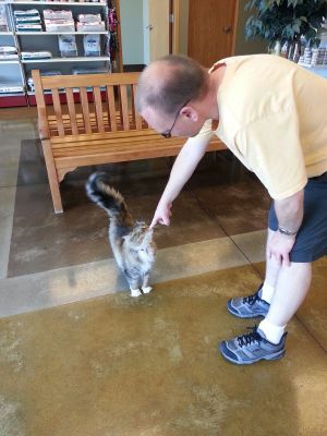 After lunch, we went to our vet to pick up dog food and allergy pills……….and where Aaron got to pet Cato, the resident cat. Then to Dillon’s for one of his prescriptions, and for junk food, and where of course Aaron had to try out the lounge chair that was on sale.