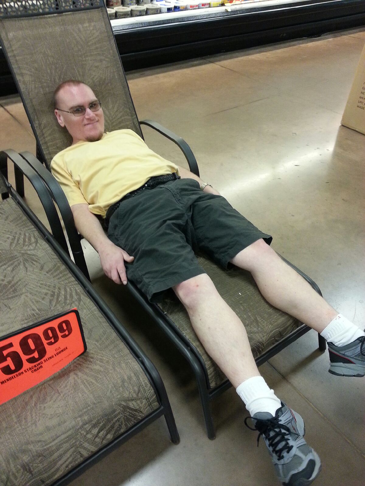 After lunch, we went to our vet to pick up dog food and allergy pills……….and where Aaron got to pet Cato, the resident cat. Then to Dillon’s for one of his prescriptions, and for junk food, and where of course Aaron had to try out the lounge chair that was on sale.