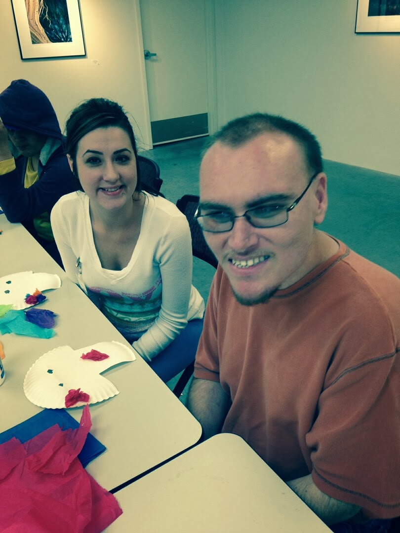 Last week Aaron went with his day group to City Arts, where he made a Halloween mask and also a necklace. He asked Misty, one of his staff, to send me a picture of them as he sat at the table. There he was in the picture, smiling and happy. Aaron, who really doesn’t like anything crafty very well, was having a great time that day. It made me happy, too…………and a little surprised to see him this way when he’s using his awkward fingers to make something. His lack of good manual dexterity usually causes anger, but on this day he was truly having a good time.