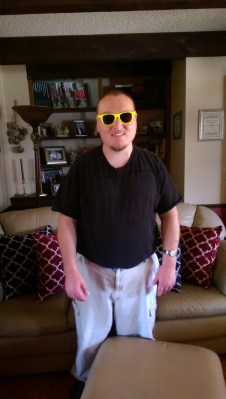 Yesterday Aaron rushed in the house when he came home from his day group. He had a huge smile on his face, but he had something else, too. He was wearing bright yellow shades, as he calls them, and he was quite happy with his new look. His huge smile was as bright as those sunglasses that Bryan had bought him that afternoon. He let me take a picture to send to Andrea, Andrew, and Megan, and he was happy with their responses.