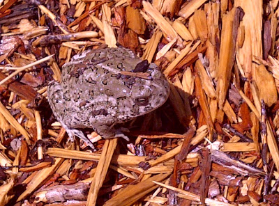 I saw him out of the corner of my eye as I watered one of our back flower beds on a very hot afternoon. I wasn’t sure what it was that had drawn my attention and so I leaned down slightly to see what had created the slight movement that I had seen. And there he was, with his head and half of his body sticking out of his little underground home. A small toad! So now I knew what had been living in that mysterious hole that had been dug in the mulch among the pink Coneflowers. I was very relieved that it wasn’t a huge spider, for one thing, and I also thought that this wee fellow was pretty cute.