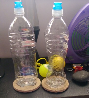 Sure enough, in his room stood his two water bottles. Totally empty. Two. Not one. And not one half.