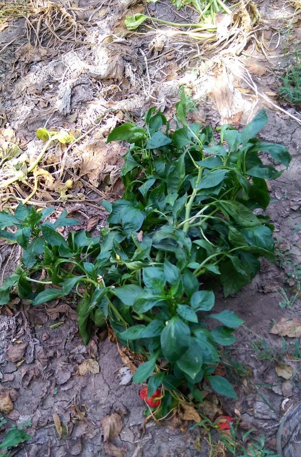 I bent over and gently lifted it, realizing then that the main stem of the pepper plant was unbroken and was still safely in the soil. “Why not just leave it and see what it does?” I thought. And that’s what I did. I left it to grow if it would, knowing that if I messed with it and tried to bend it back up, I would just break it and kill it for sure. So I let it remain where it was, bent over and not looking too promising at that point.