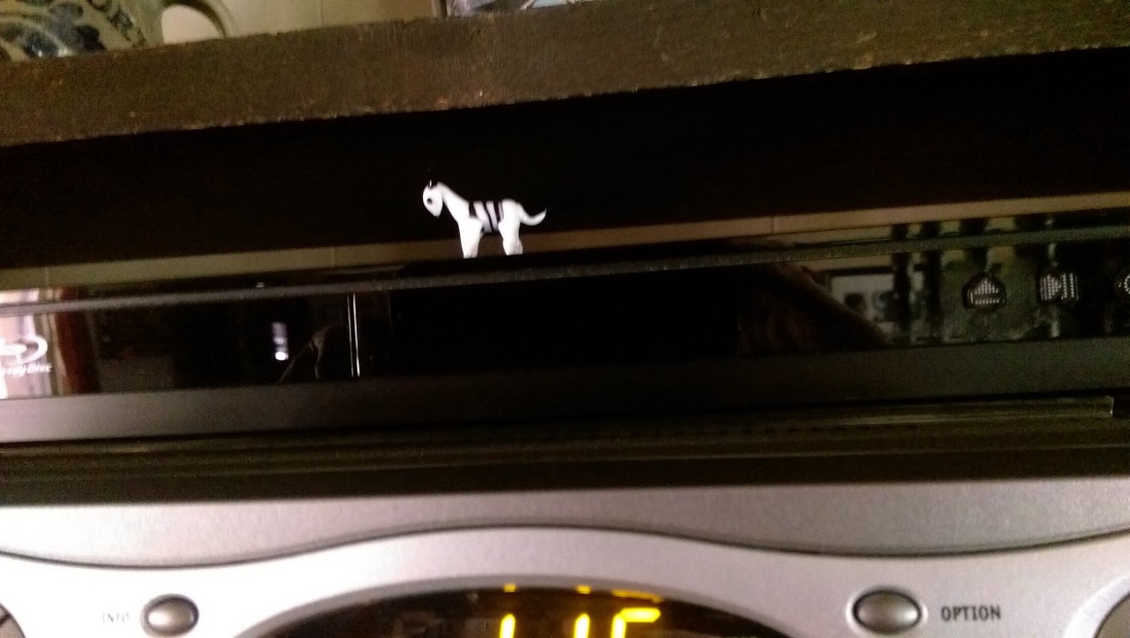 Now it sits on top of our DVD player, where it’s mostly safe from being broken.  You can hardly see it from across the room, it’s so little.  But the joy on Aaron’s face when I opened it was huge, and so was the joy in my heart.