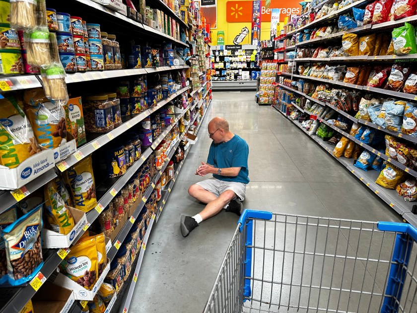 It’s Aaron sitting on the floor of the store, totally oblivious to anyone around him as he checks out the peanuts on the bottom shelf.