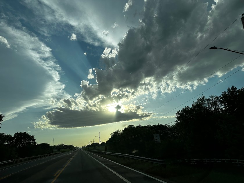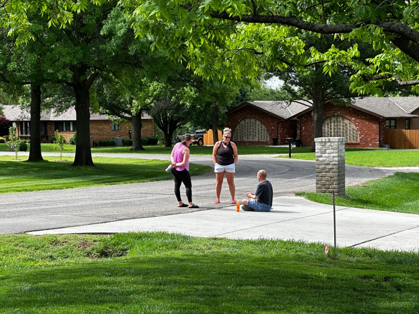 I was out for a bit yesterday morning and when I drove back to the house, there was Aaron sitting at the end of our neighbor’s driveway…talking, of course, and showing our two very sweet neighbors his sticker books.