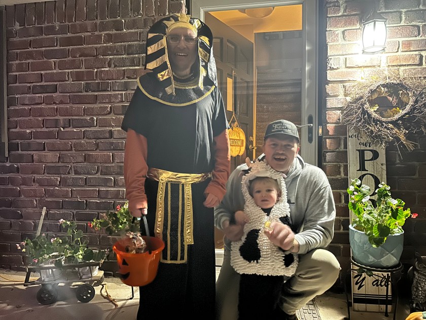 Another very fun event was taking Ryker trick-or-treating in our neighborhood. We didn’t know if he would wear his outfit, but he did, and he loved every minute of it. Of course, this Gramoo was smiling from ear to ear at our adorable little cow!