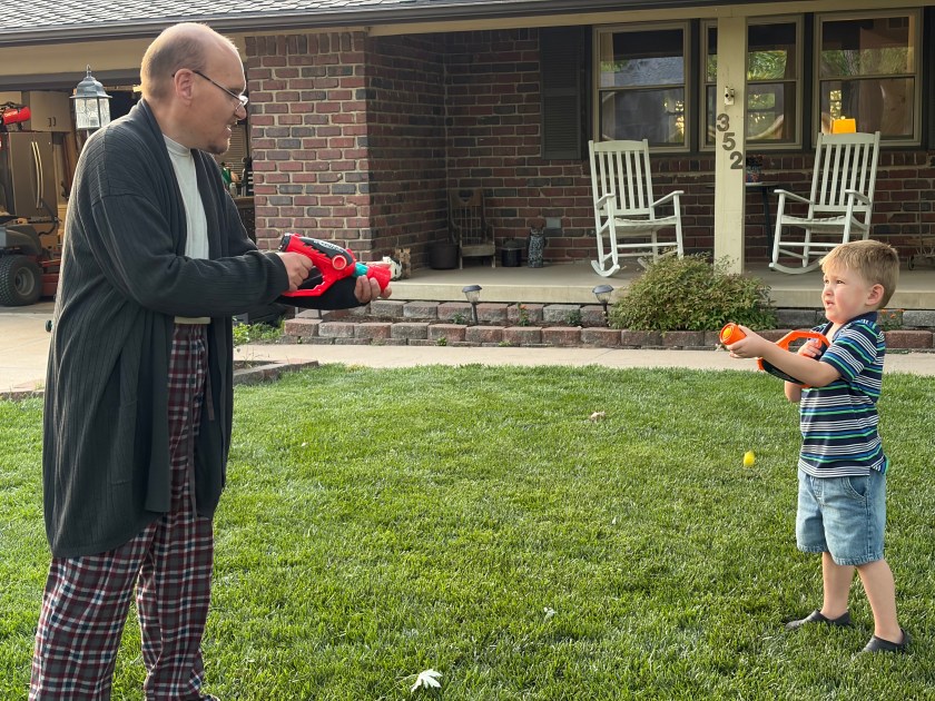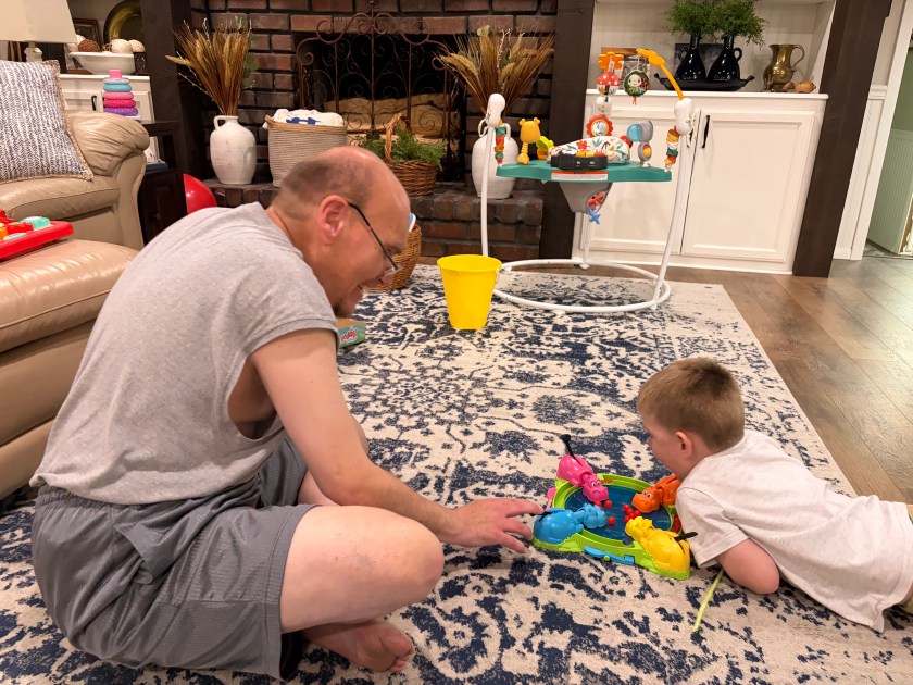 Aaron doesn’t like his routine and schedule to be disrupted any more than he likes his sheets and blankets to be jumbled and wrinkled. A three-year-old and a one-year-old are, to Aaron, major wrinkles in his otherwise (mostly smooth) life at home.