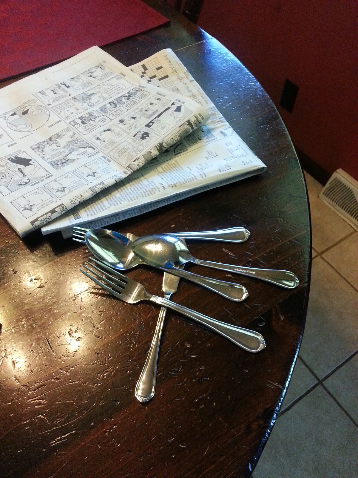 All the while, he was telling me about eating five pancakes but leaving the others on the plate, and wondering if Jackson could have the ones he didn’t eat……….and if it was OK that he let Jackson eat the crumbs that were on the floor. I wondered if the crumbs were more like bite-sized chunks that he conveniently left on the floor for his dog buddy to eat, but knowing I wouldn’t get an accurate answer I just left that unsaid. I agreed that we could take Jackson with us for our drive to meet Aaron’s group, so off we headed for the van……..after Aaron made sure that I put in his computer keyboard. As we passed the kitchen table, I saw Aaron’s empty plate and then the pile of untouched silverware there on the side. I always shake my head at Aaron’s need of multiple pieces of silverware, no matter what he eats. It’s like a security blanket for him, always necessary but rarely ever needed.