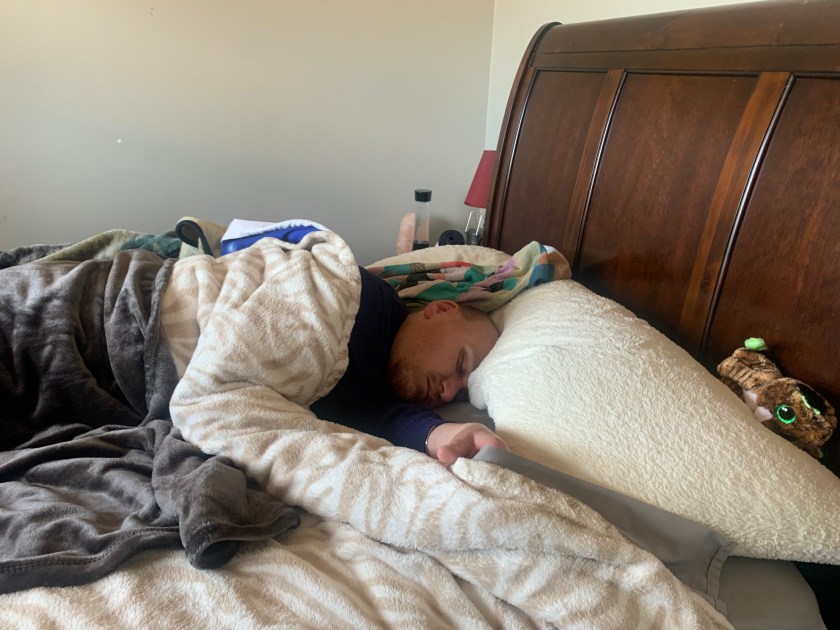 I was looking at my own backdrop at home, which consisted of all Aaron’s bedding after his seizures earlier Friday morning.