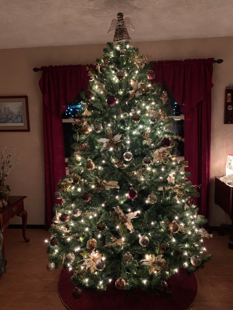 I turned to see him staring intently at our little tree that is full of my Grandma Holly’s handmade ornaments, made with love so many years ago. This was a pre-lit tree, but as so often happens, those bulbs had long since burned out. I had replaced them with another strand of lights but left the unlit lights on the tree – hidden, so I thought, by the new lights.